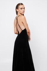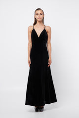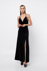 Sophisticated with contemporary detailing, the Eulalie Maxi Dress is highlighted by its velvet fabrication and flattering A-line silhouette. This black design sports a v-neckline, thin straps that cross over the back and a front split. Style with a pointed stiletto heel and a small clutch for your next evening event.