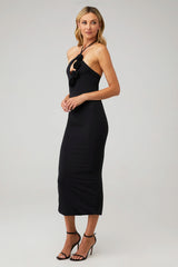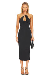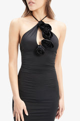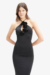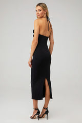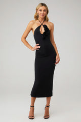 The feeling's mutual. The Lily Midi Dress is a sensual style with a fitted silhouette that sheathes the figure and dramatic roses lining a keyhole cutout at the bust. An event style.