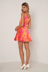 This gorgeous mini dress features a scoop-style neckline & fun floaty skirt. The tulle sewn under the skirt creates the perfect fullness. Designed using a thick satin fabrication, this dress is sure to turn heads. Also available in Floral.