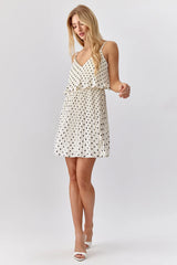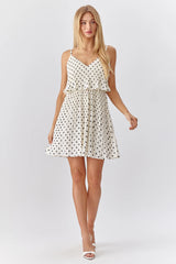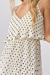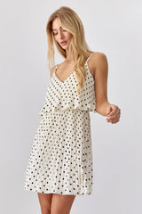 This pleated, polka dot mini is layered for fun shapes and textures. Though interesting in all forms of design, this piece is easy to wear out in casual settings.