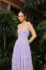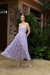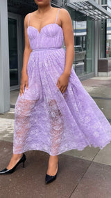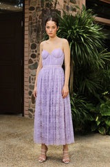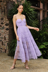 Lavender lace dress is a dreamy semi-sheer lace midi dress featuring a pleated bustier-style bodice with underwired cups and velvet spaghetti straps, a velvet waistband and a flowy A-line skirt.